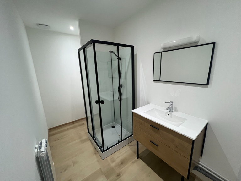 Un appartement neuf au 1er étage au coeur du centre ville offrant cuisine avec plaque + four, séjour, une chambre, salle de douche avec wc.